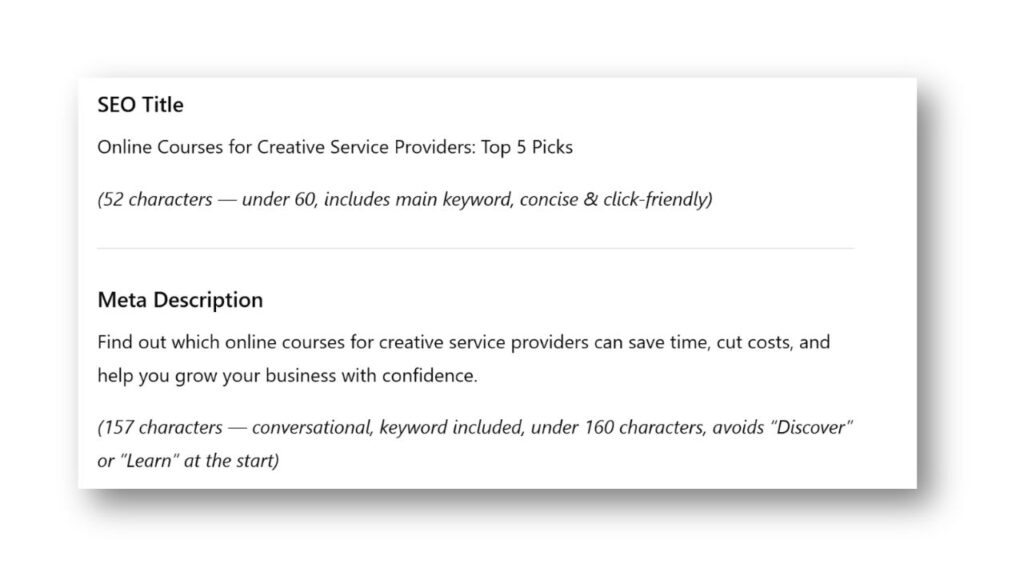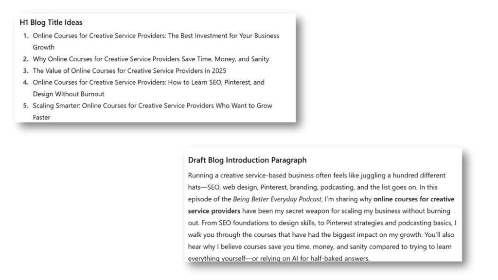 Prompt: My main targeted keyword is “online courses for creative service providers” Can you give me 5 H1 blog titles that are related to the podcast and include the main targeted keyword as well as draft me an introduction paragraph that summarizes what the episode is about and utilizes that keyword?