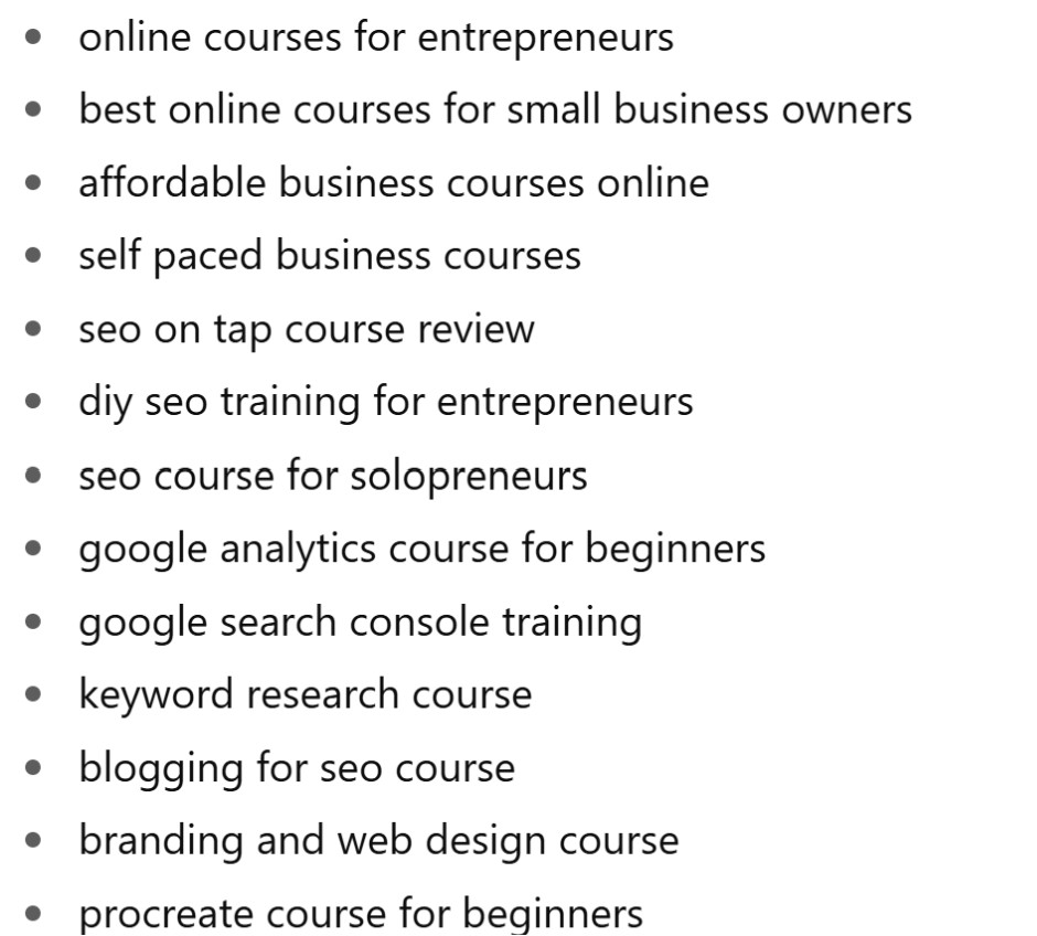 For example, when I recorded an episode about why I love courses, “best online courses for small business owners” was too competitive. But “online courses for entreprenuers” was a perfect fit—lower volume but targeted and relevant.