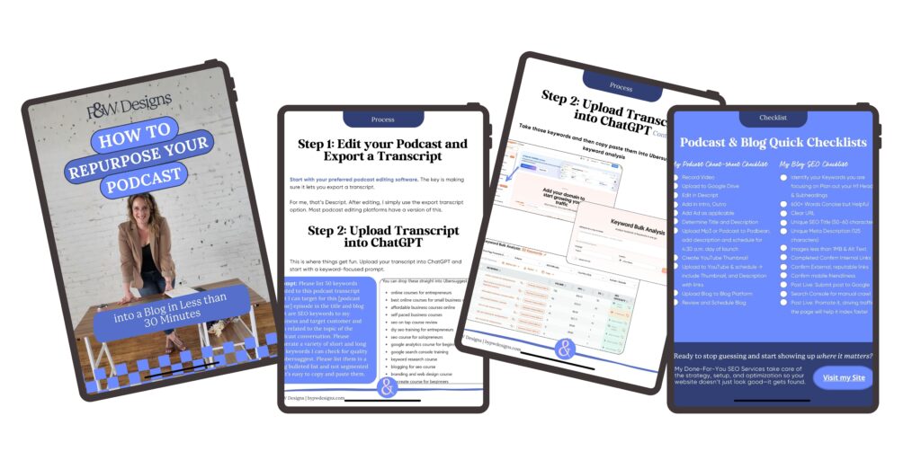 Repurposing your podcast into a blog doesn’t need to be complicated. With the right system, you can do it in less than 30 minutes while boosting your visibility and connecting with the people searching for what you offer.