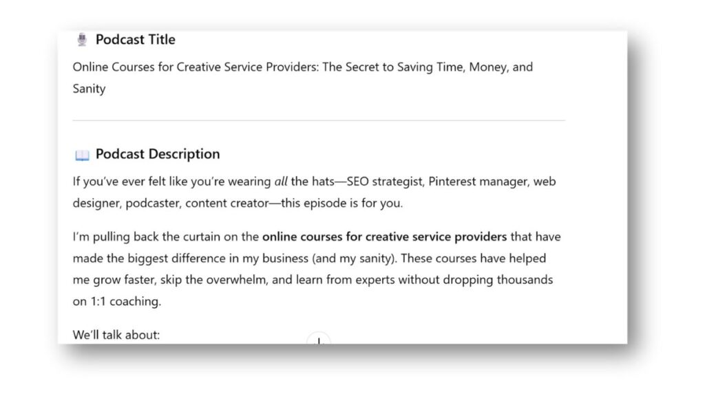 Staying in your brand voice is key. I have ChatGPT create both a podcast episode title and description that sound conversational while weaving in my target keyword.